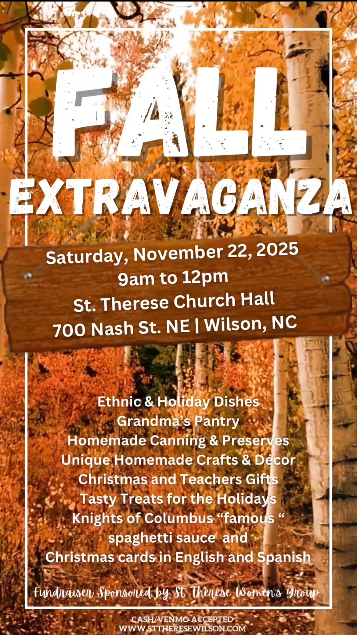 Será el 1 de noviembre de 8 am a 5 pm en la iglesia St. Michael Catholic Church en Cary: 804 High House Rd, Cary, NC 27513