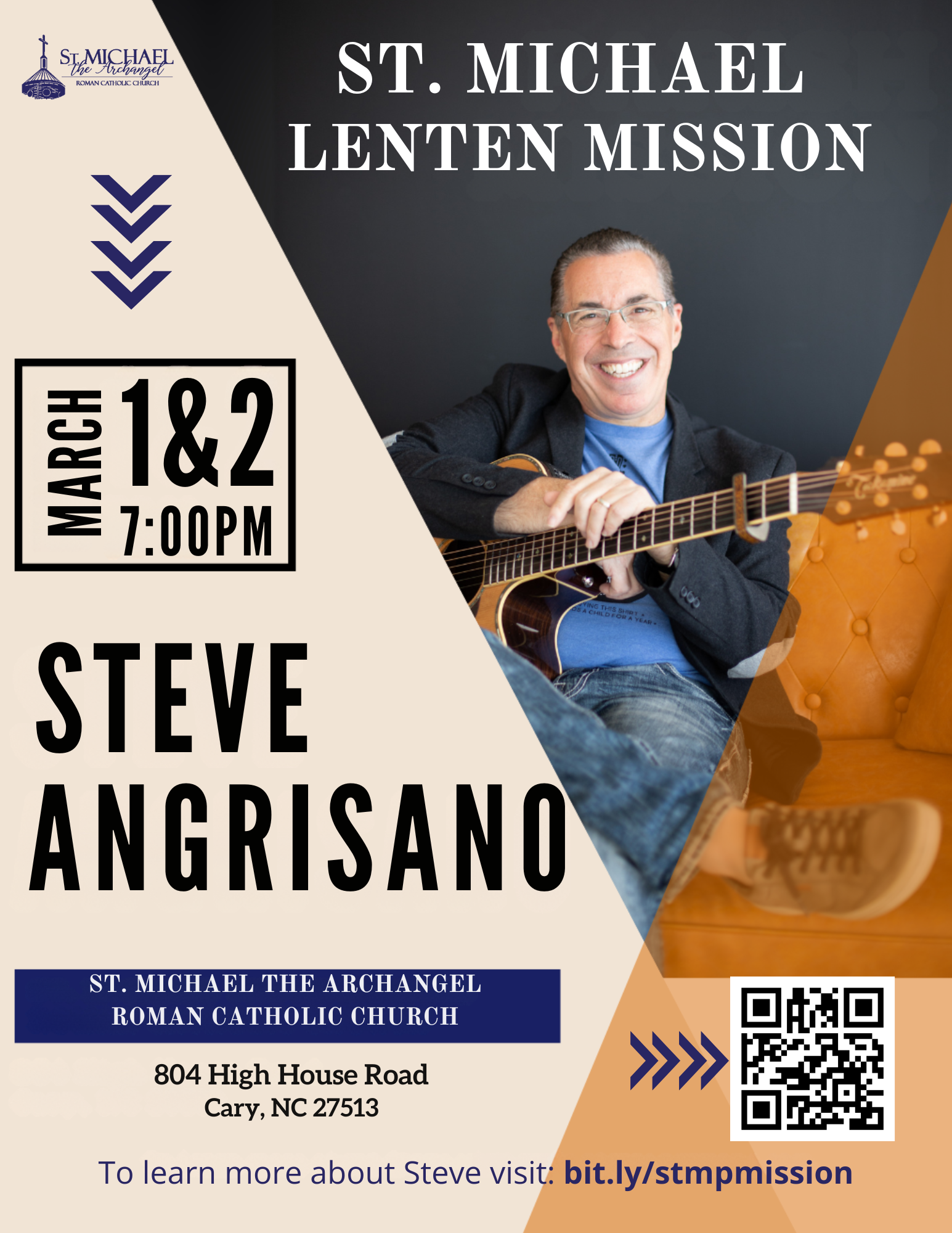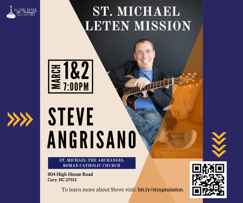 Parishioners from neighboring parishes are invited to join St. Michael the Archangel Catholic Church for a Lenten Parish Mission with Steve Angrisano on Sunday, March 1 and Monday, March 2 at 7:00 PM. Through music, story, and prayer, Steve will lead us in an inspiring evening of faith and renewal as we prepare for Easter. Free and open to all. Learn more at bit.ly/stmpmission. Location: St. Michael the Archangel Catholic Church, 804 High House Rd., Cary, NC 27513