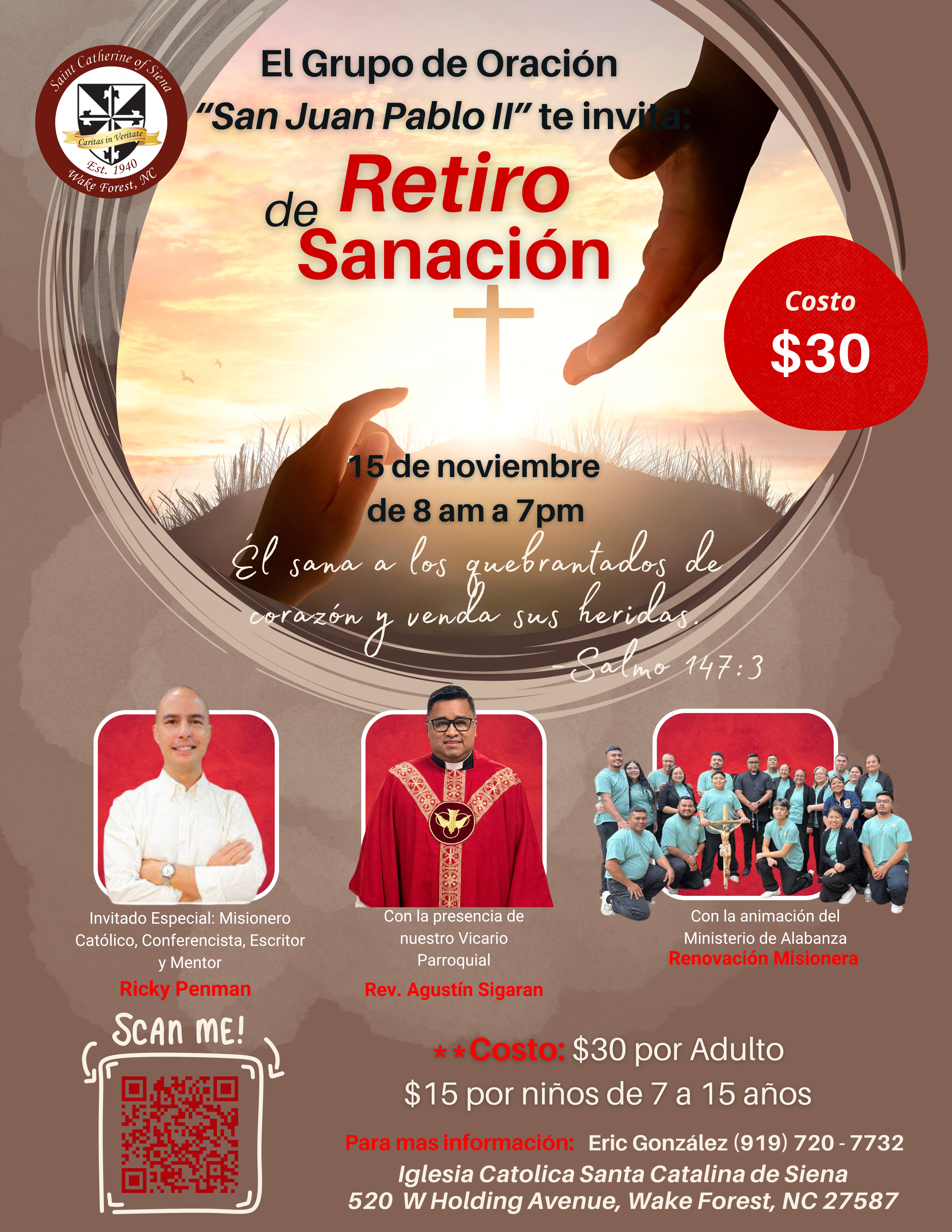 Add to Calendar 2025-11-15 08:00:00 2025-11-15 08:00:00 Retiro de Sanction Evento de Sanación El Grupo de Oración Renovación Carismática San Juan Pablo II te invita a un poderoso evento de sanación, que contará con la presencia de Ricky Penman y de nuestro Vicario Parroquial, el Padre Agustín Sigarán Donis. La música de alabanza estará a cargo del Grupo Renovación Misionera, que nos guiará en un ambiente de fe y alegría. Fecha: Sábado, 15 de noviembre de 2025 Horario: De 8:00 a.m. a 6:00 p.m. Lugar: Gimnasio de la Escuela Santa Catalina de Siena Costo: $30 por adulto / $15 por niño ¡No te pierdas esta oportunidad de encuentro con el Señor y de renovación espiritual! Flyer (PNG) St. Catherine of Siena Church Diocese of Raleigh techsupport@faithcatholic.com America/New_York public