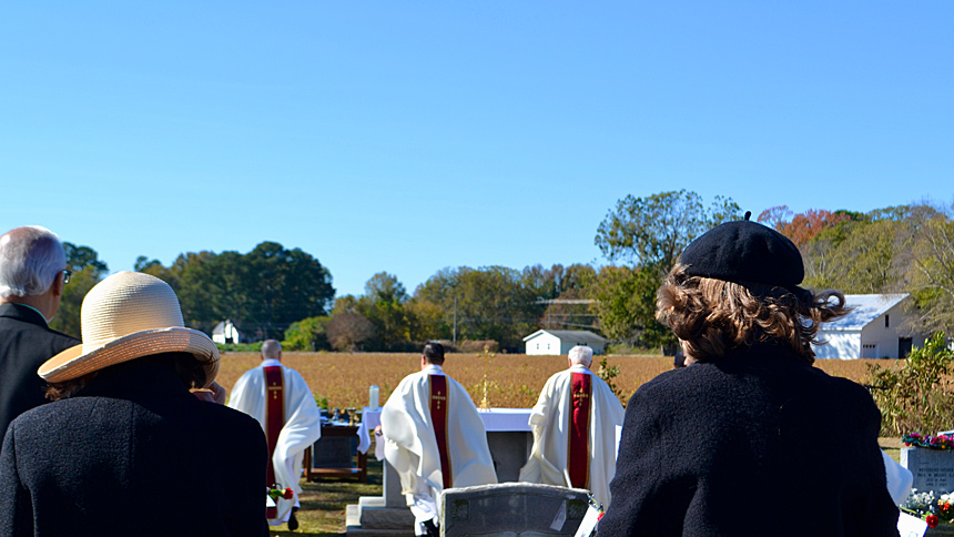 NEWTON GROVE, NORTH CAROLINA – The wind was catching many things. The white cloth covering the outdoor altar was anchored by candles at its corners, and the chasubles, or robes, of the priests and jackets of those gathered shifted with the breeze. Under sunlight and the occasional falling leaves, the Diocese of Raleigh held its annual Mass for deceased priests and bishops Nov. 5 on the grounds of Our Lady of Guadalupe Church.