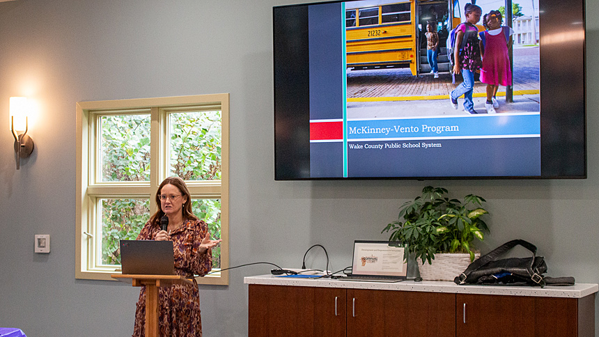 Sara Davis, a social worker for Wake County Public School System’s Students in Transition Program, shared an overview of the federal McKinney-Vento Homeless Assistance Act and highlighted the growing needs of students experiencing homelessness, particularly in Wake County and other metropolitan areas. Her presentation underscored the importance of advocacy, awareness and community support for vulnerable children and families.