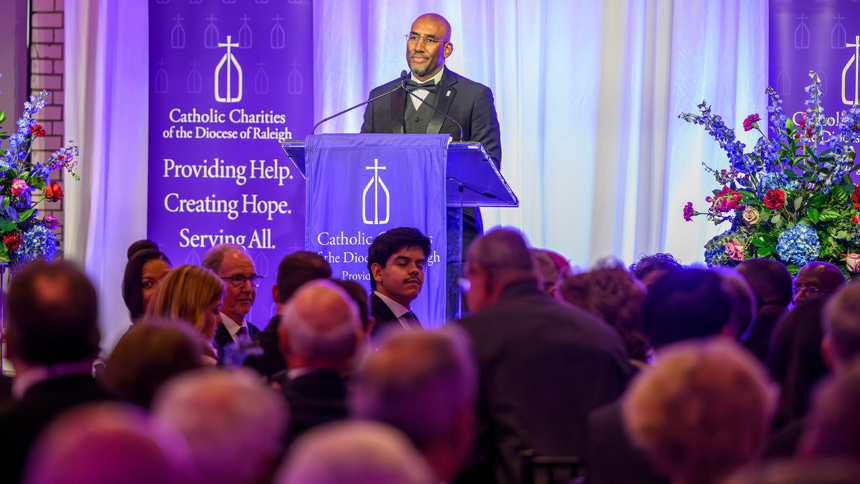 The evening opened with a lively cocktail reception before guests were welcomed by WRAL anchor and former Catholic Charities board member Ken Smith, who served as master of ceremonies. “Tonight, you’ll hear stories of compassion and resilience, stories that remind us how Catholic Charities provides help and creates hope for nearly 300,000 individuals each year,” Smith said, setting the tone for the night’s program.