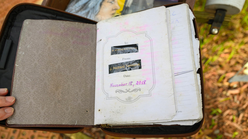 Lemon había visitado la casa de los Tamisiea cuando las Estaciones estaban aún allí. Está segura de que a él le habría encantado ver las páginas llenas de nombres de las personas que han visitado el jardín para orar durante los últimos ocho años. También le habrían hecho sonreír los dones adicionales ofrecidos, incluidas las placas de madera colocadas debajo de cada estación—un proyecto liderado por una monaguilla y una Girl Scout, Maura Olson, de la parroquia de San Estanislao.